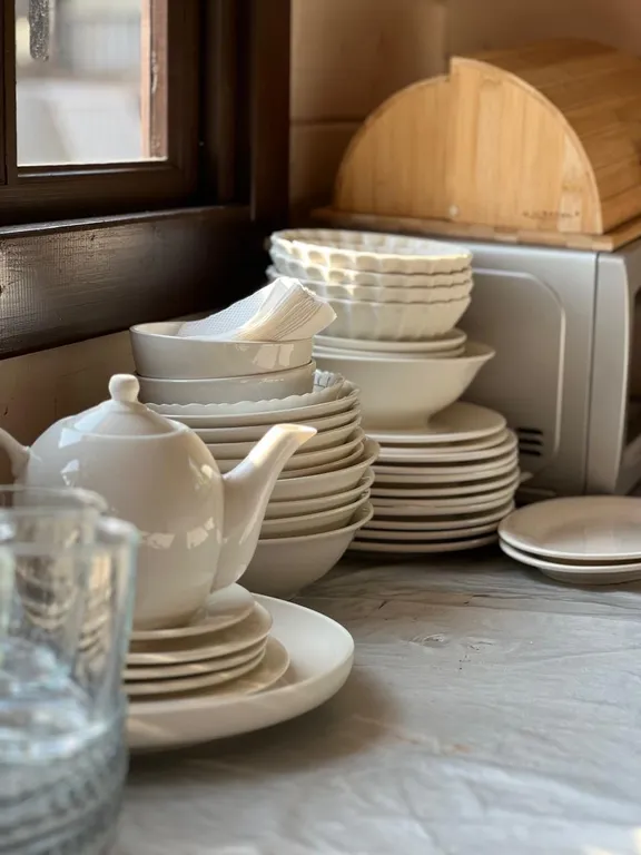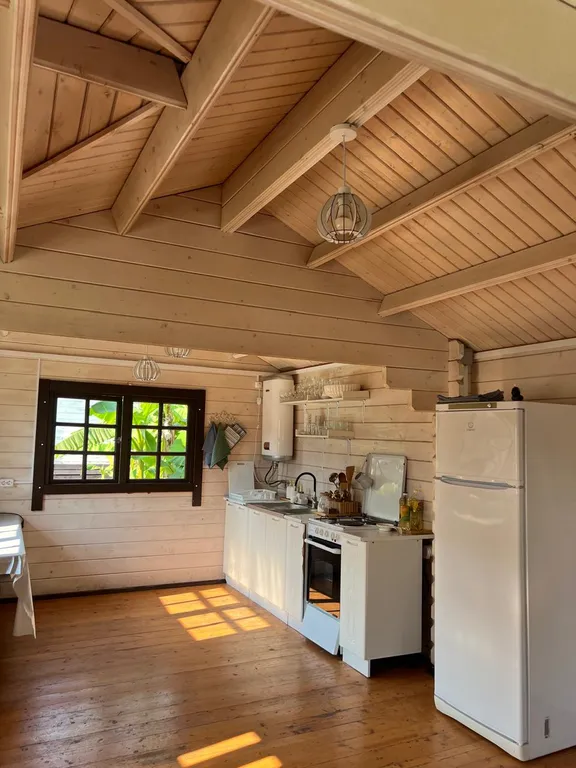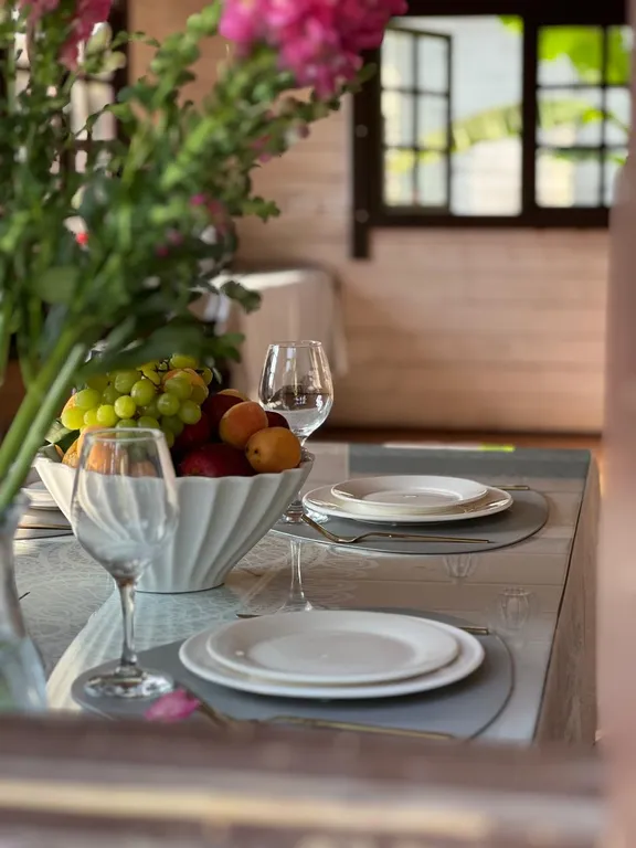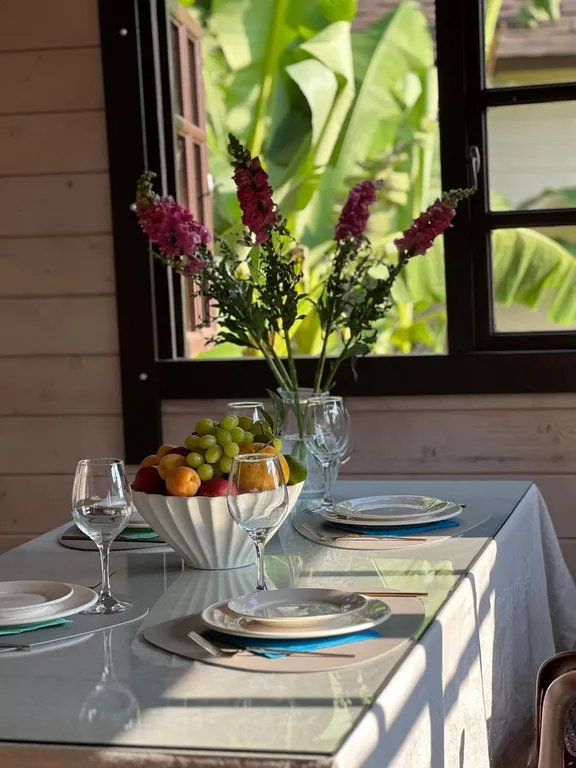 Если стоять лицом к отелю, то находишься практически у подножия горы, очень красиво. Девочки стараются облагородить территорию, есть красивая открытая зона со столом и креслами под покровом сосен, окружённая экзотическими цветами, в темное время суток красиво подсвеченная. Сами домика отеля достаточно симпатичные, на кухне общего пользования красивая посуда, которой приятно сервировать стол.